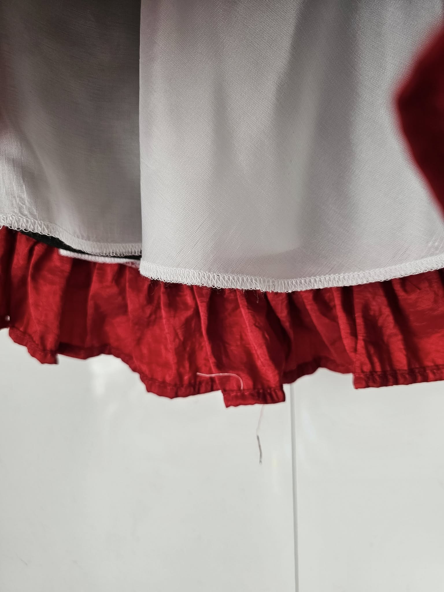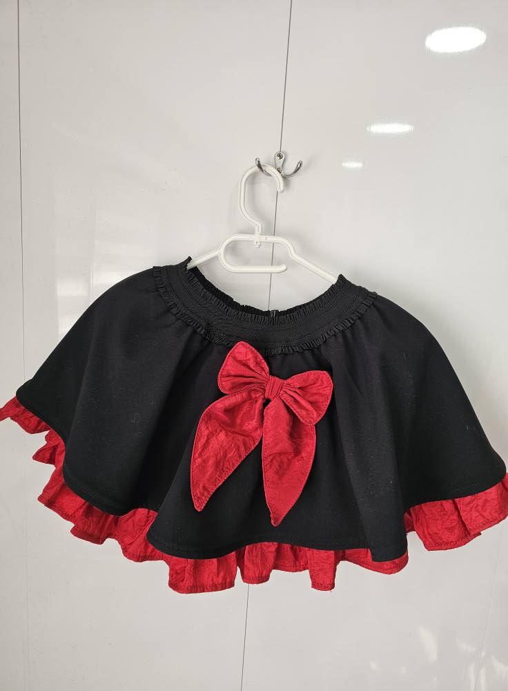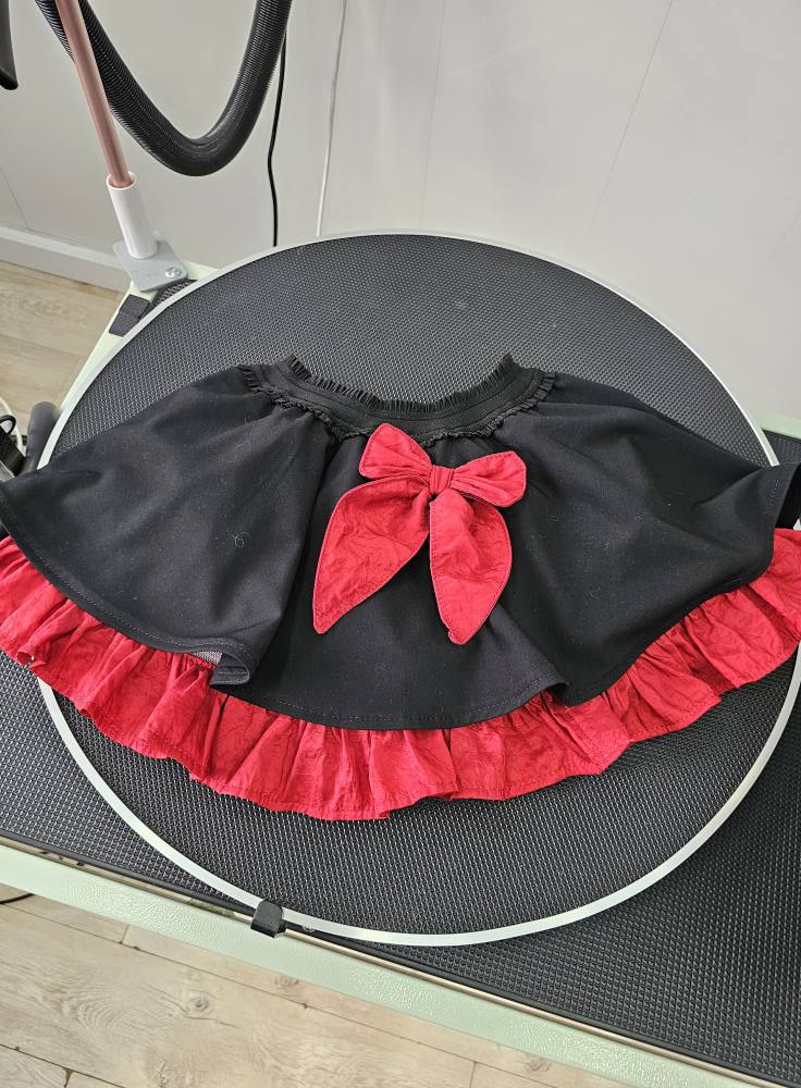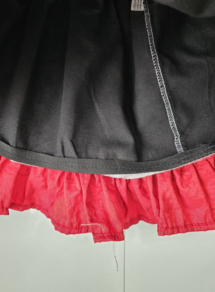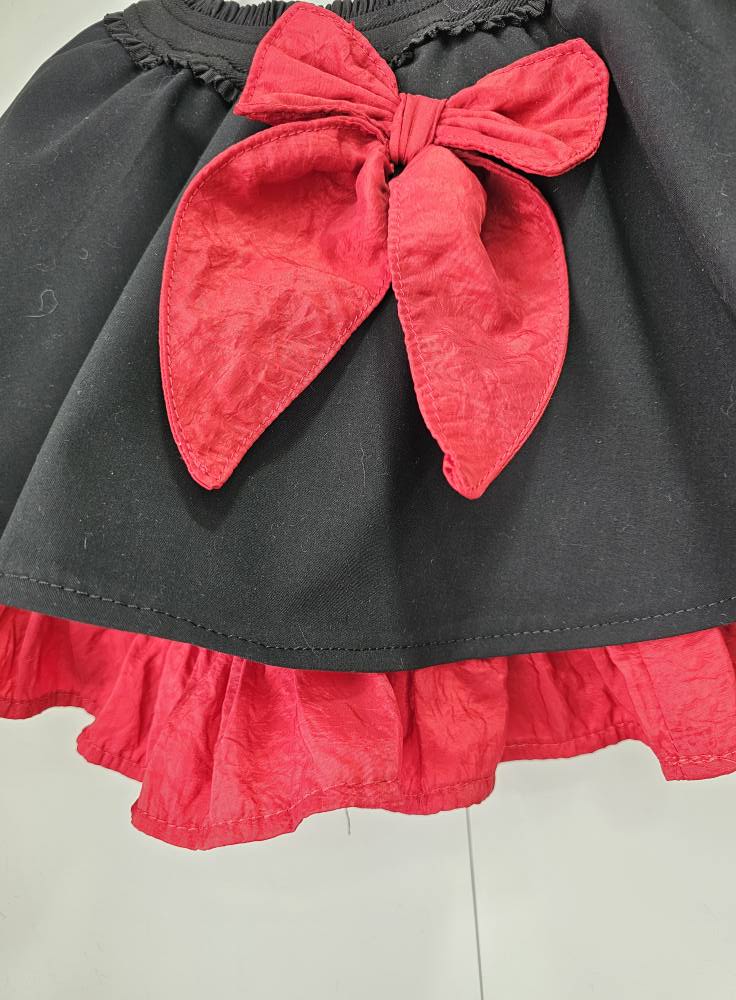 Dół sukienki tworzy rozkloszowana, lekko falowana spódniczka, wykończona szeroką, czerwoną falbaną dodającą lekkości i dziewczęcego uroku. Centralnym punktem modelu jest duża, dekoracyjna kokarda z czerwonej tkaniny, która pięknie podkreśla całą stylizację.